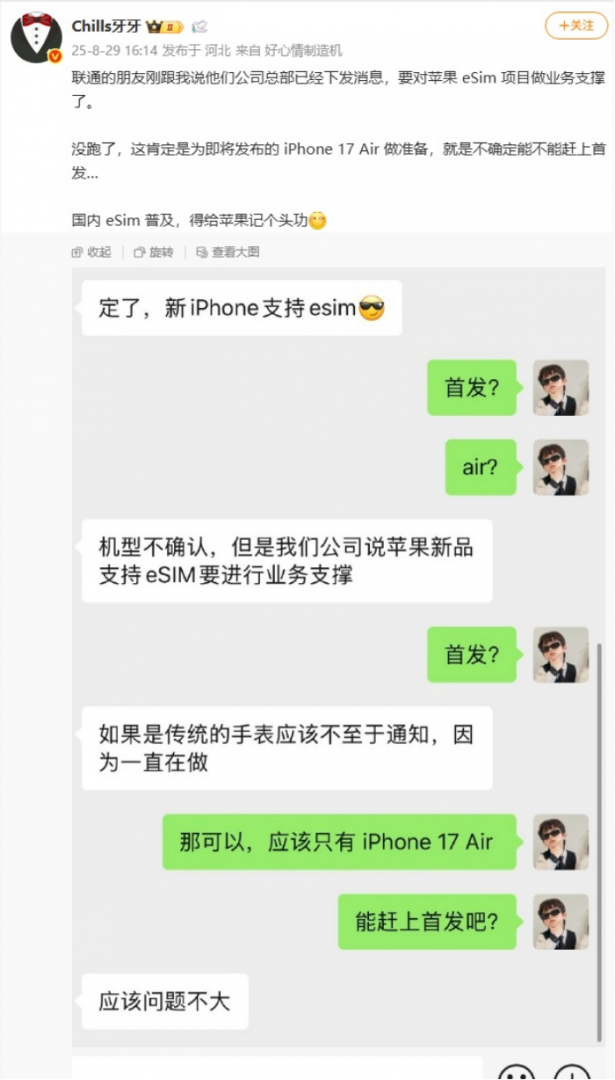 博主@Chills牙牙认为,联通此举是为即将发布的iPhone 17 Air做准备,但是不确定能不能赶上首发。